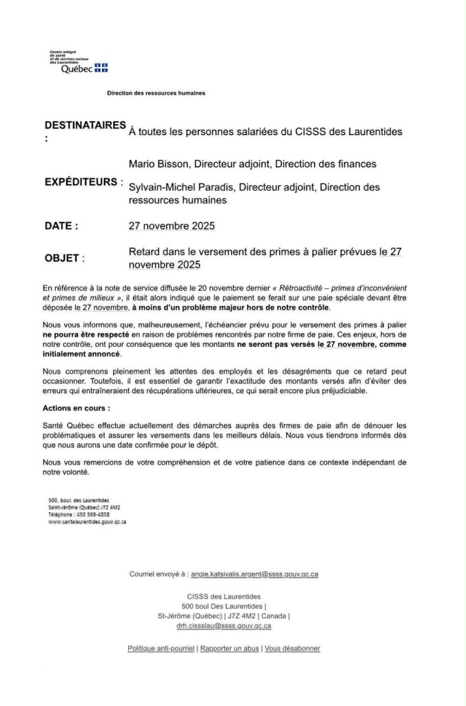 Alors que le dépôt des primes a paliers avait été confirmé par l’employeur la semaine dernière, il nous annonce maintenant qu’à la veille du dépôt, il est incapable d’obtenir une confirmation du dépôt par le fournisseur de paie privé Médisolution.