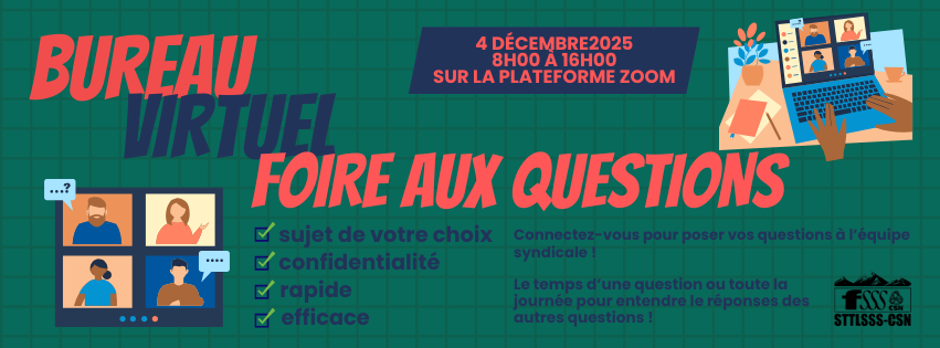 Le STTLSSS-CSN tiendra un bureau virtuel; foire aux questions le 4 décembre 2025 entre 8h00 et 16h00.