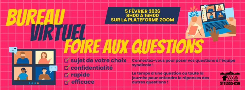 Le STTLSSS-CSN tiendra un bureau virtuel; foire aux questions le 5 février 2026 entre 8h00 et 16h00.