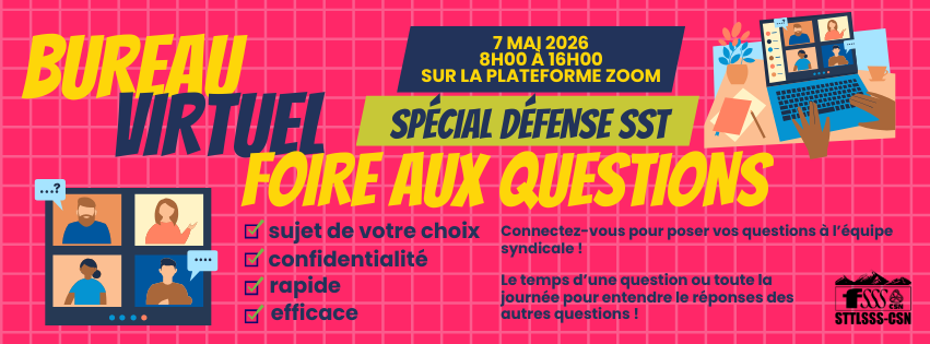 Le STTLSSS-CSN tiendra un bureau virtuel; foire aux questions le 7 mai 2026 entre 8h00 et 16h00.